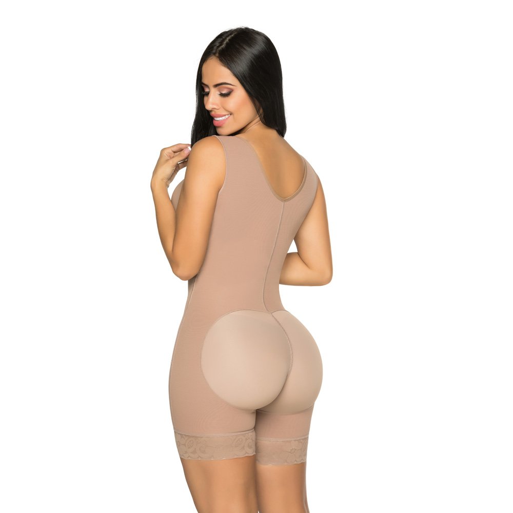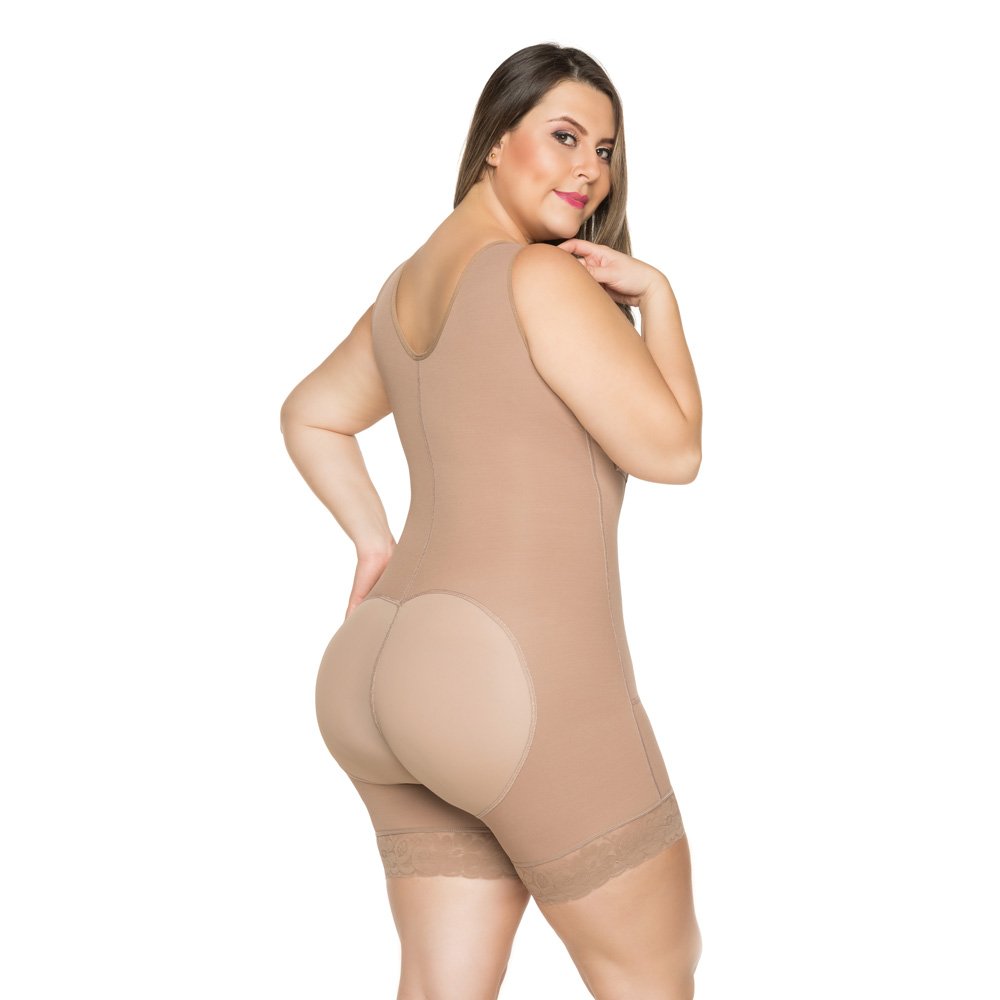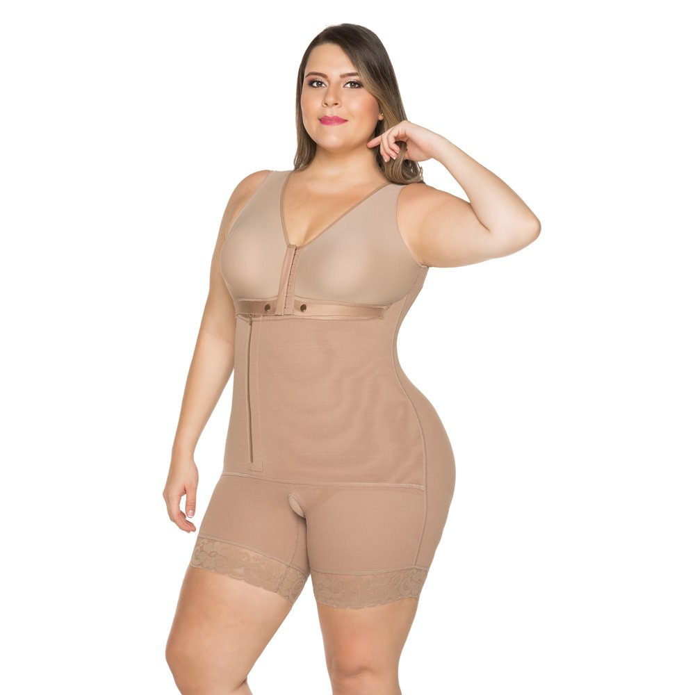 Faja short con brasier en spandex. Copa prehormada con 2 niveles de broche central. Diseño de cierre lateral con broches internos. Tapa perineal y diseño de pierna con terminado en encaje siliconado.