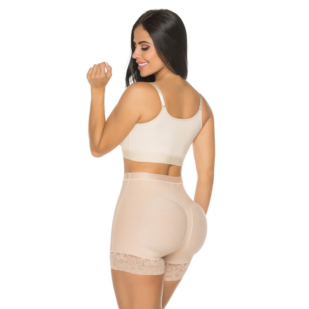 Short talle alto con huecos forrados. Realce de glúteos, terminaciones en encaje siliconado.
