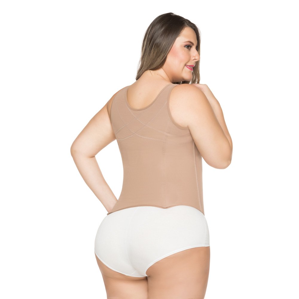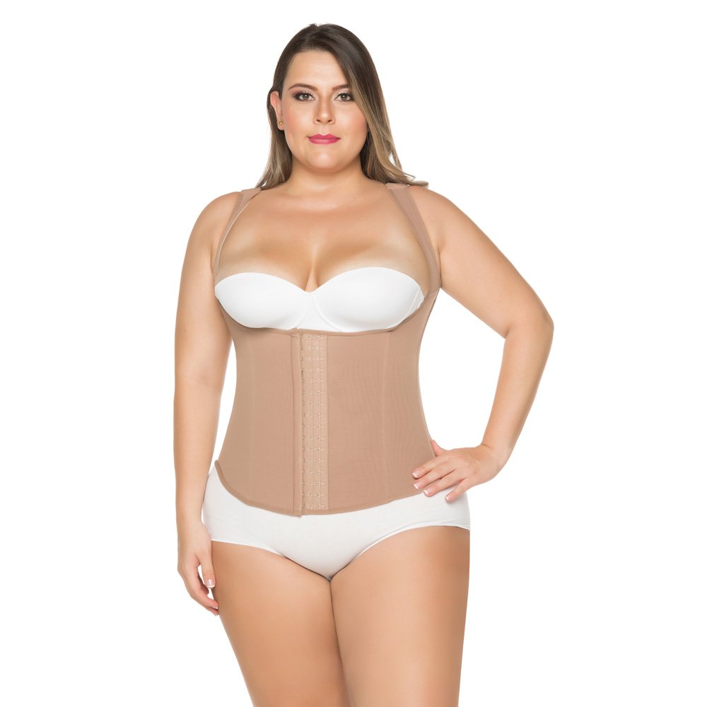 Chaleco con 3 líneas de broches, varillas metálicas flexibles que dan firmeza a la prenda. Senos libres y espalda alta cubierta.