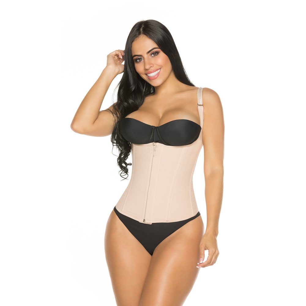 Chaleco busto libre, tiras ajustables y removibles, varillas metálicas flexibles que dan firmeza a la prenda con broches internos más cierre frontal. Espalda alta.
