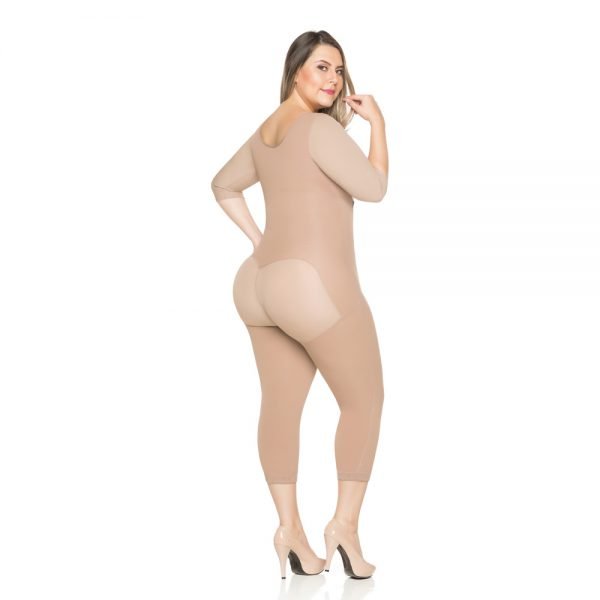 Faja con mangas 3/4 senos libres. Broches internos con cierre lateral. Diseño especial en glúteos para mayor realce, apertura en área perineal y diseño de pierna hasta el tobillo.