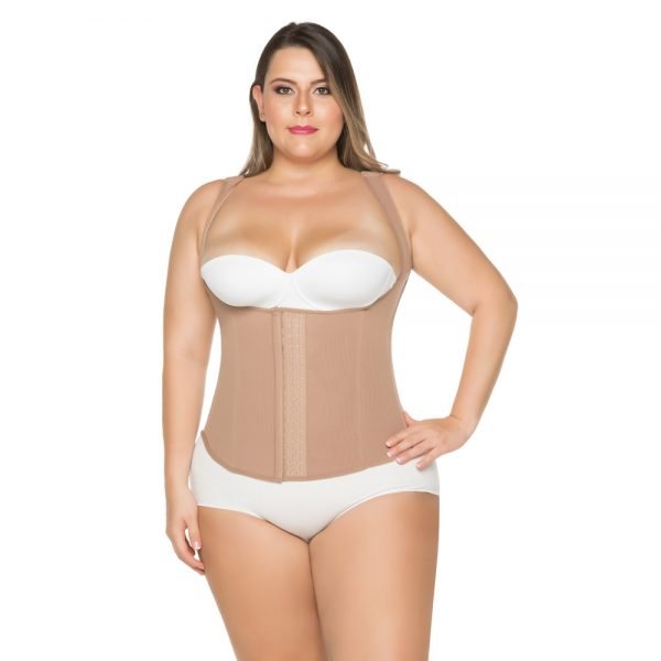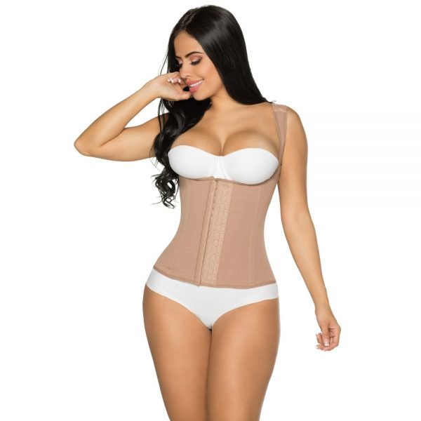 Chaleco con 3 líneas de broches, varillas metálicas flexibles que dan firmeza a la prenda. Senos libres y espalda alta cubierta.