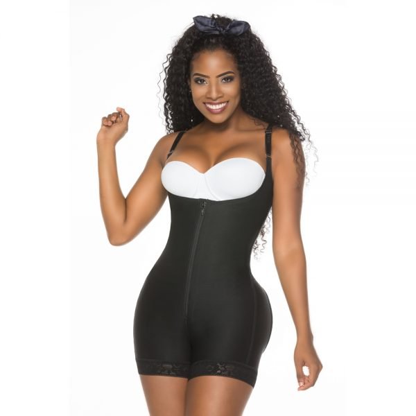 Faja short senos libres, espalda alta con tiras removibles y ajustables. Broches internos y cierre frontal. Huecos forrados en la parte posterior que da alto realce a los glúteos, terminación en encaje siliconado, abertura en el área perineal.